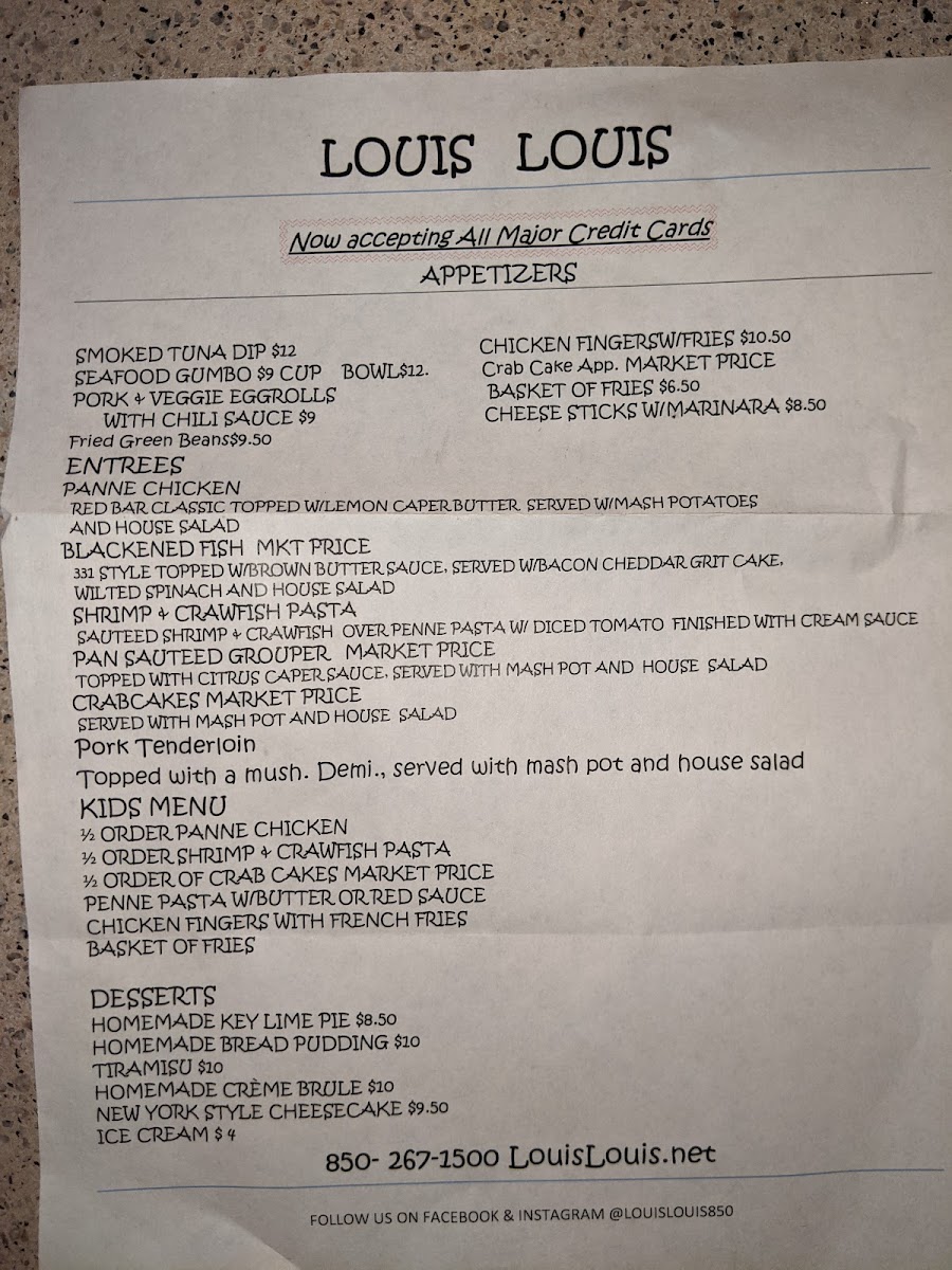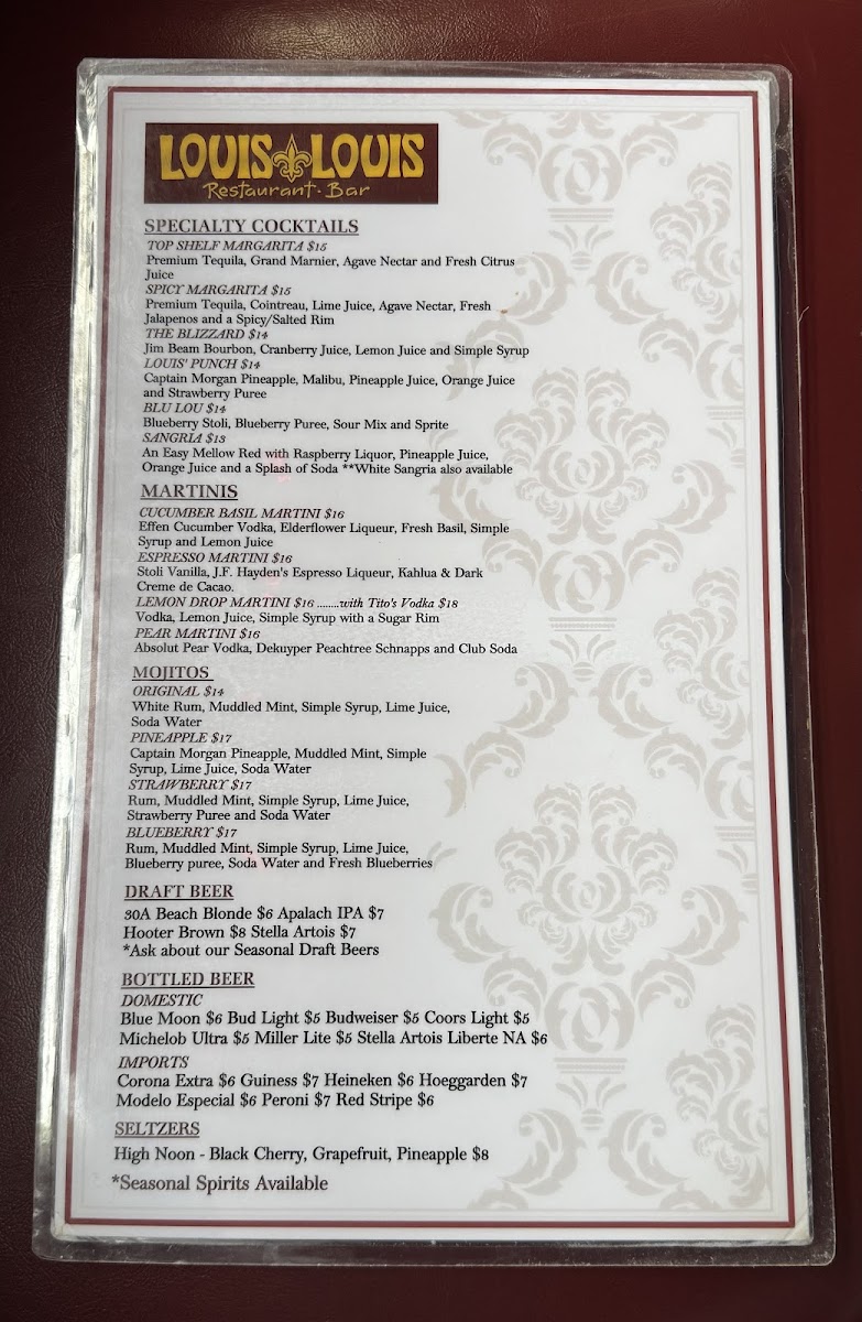 At Louis Louis, you'll find a delightful blend of coastal charm and mouthwatering dishes, perfect for a relaxing meal by the beach. Nestled at 35 Mussett Bayou Rd, Santa Rosa Beach, FL, this menu offers a refreshing array of seafood, hearty entrees, and flavorful sides that showcase the best of fresh ingredients. Whether you’re craving a zesty seafood platter, a perfectly grilled steak, or a light and crispy salad, there’s something here for every taste. The ambiance complements the food perfectly, making it an inviting spot for both casual bites and special occasions. Dive into the Louis Louis Menu and enjoy a meal that’s as unforgettable as the stunning surroundings.