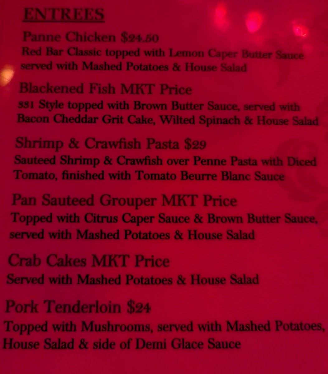 Red bar classic topped with lemon caper butter sauce served with mashed potatoes & house salad